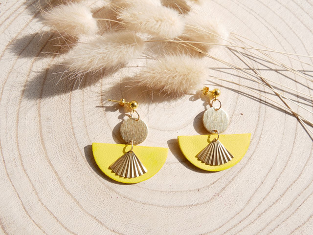 Les boucles CALIE sont composées d'un demi-cercle en cuir, accompagné d'une breloque éventail, le tout surmonté d'une breloque ronde en laiton brossé. Très colorées, elles ajoutent une touche vitaminée à vos looks !