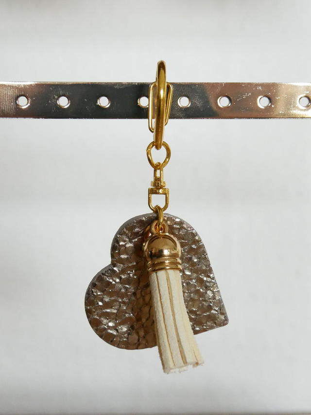 Joli porte-clés ÉLIO en forme de cœur, accompagné d'un pompon assorti.