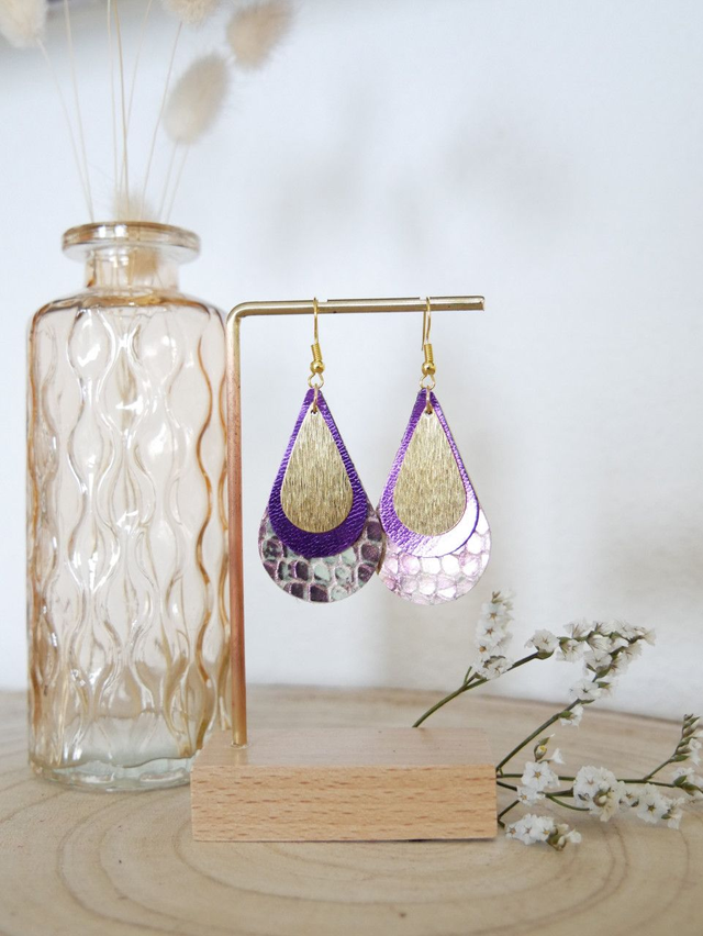 Les boucles ELLA sont composées de trois gouttes superposées, deux en cuir et une en laiton brossé. Très colorées, elles ajoutent une touche de pep's à vos tenues !