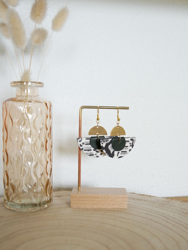 Composition : crochets en acier inoxydable, demi-cercles et gouttes en cuir, breloques en laiton