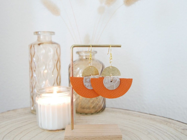 Les boucles ZÉLIE sont composées d'un demi-cercle en cuir, accompagné d'une goutte en cuir repliée, et surmonté d'un demi-cercle en laiton brossé.