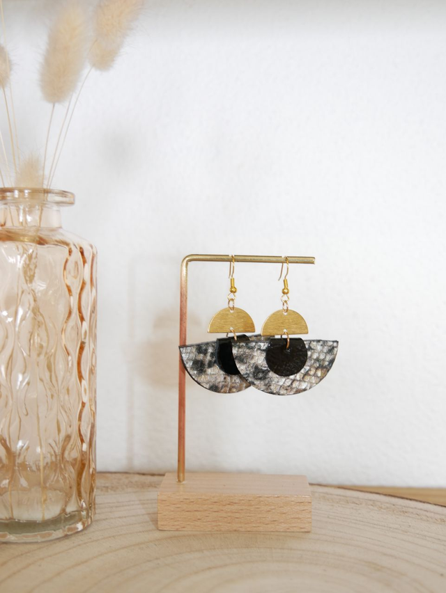 Composition : crochets en acier inoxydable, demi-cercles et gouttes en cuir, breloques en laiton
