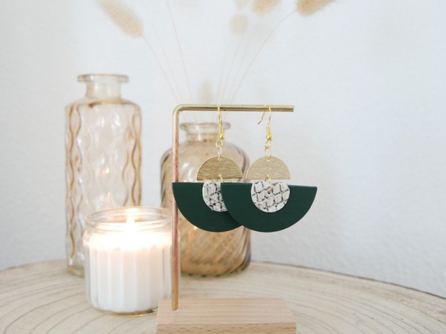 Composition : crochets en acier inoxydable, demi-cercles et gouttes en cuir, breloques en laiton