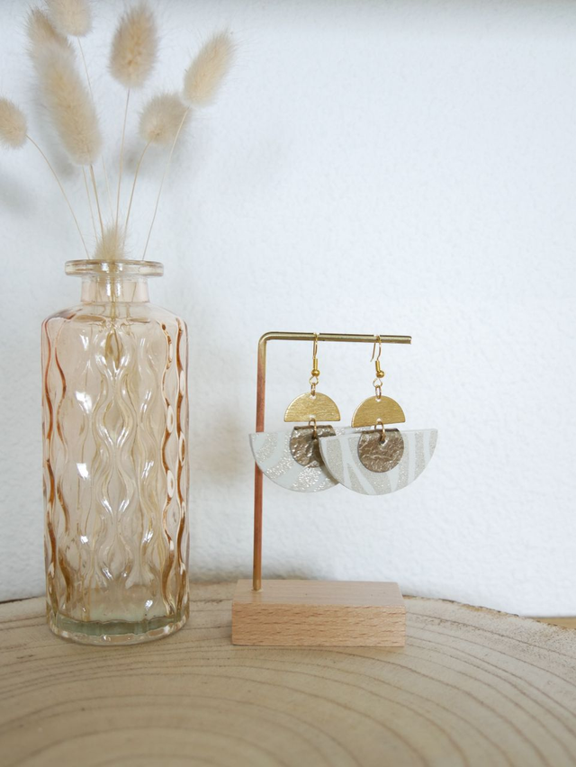 Les boucles ZÉLIE sont composées d'un demi-cercle en cuir, accompagné d'une goutte en cuir repliée, et surmonté d'un demi-cercle en laiton brossé.