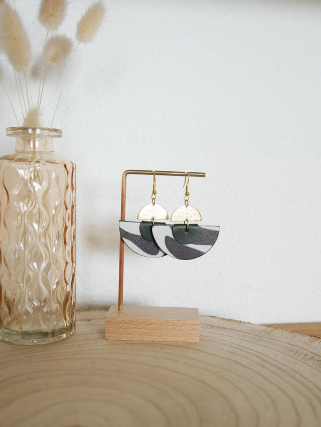 Les boucles ZÉLIE sont composées d'un demi-cercle en cuir, accompagné d'une goutte en cuir repliée, et surmonté d'un demi-cercle en laiton brossé.